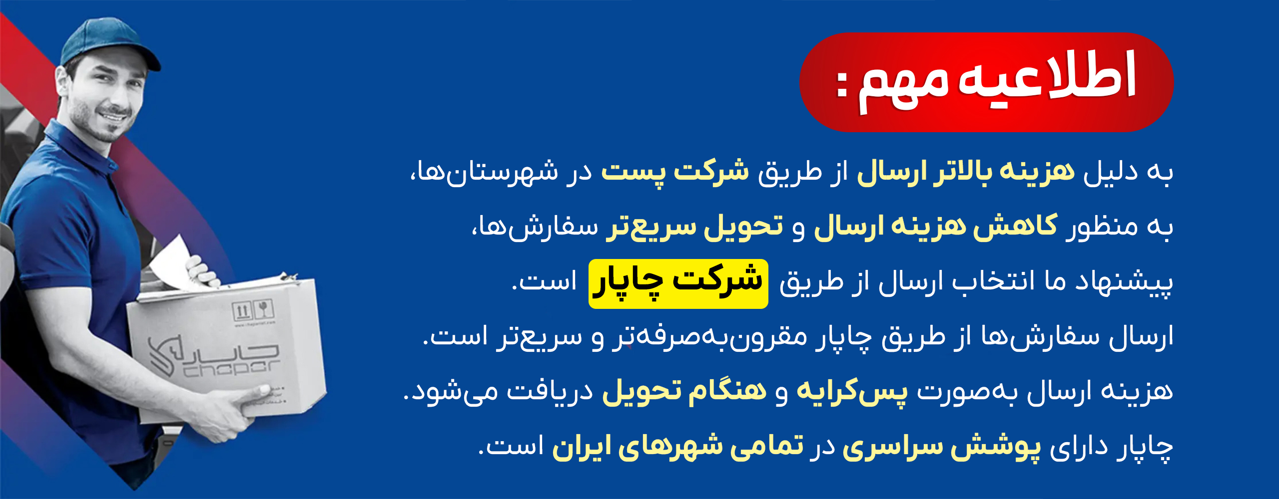 برای کاهش هزینه ارسال و تحویل سریعتر سفارشها، ارسال از طریق چاپار پیشنهاد میشود. هزینه ارسال بهصورت پسکرایه و هنگام تحویل دریافت میشود. چاپار در سراسر کشور فعال است.